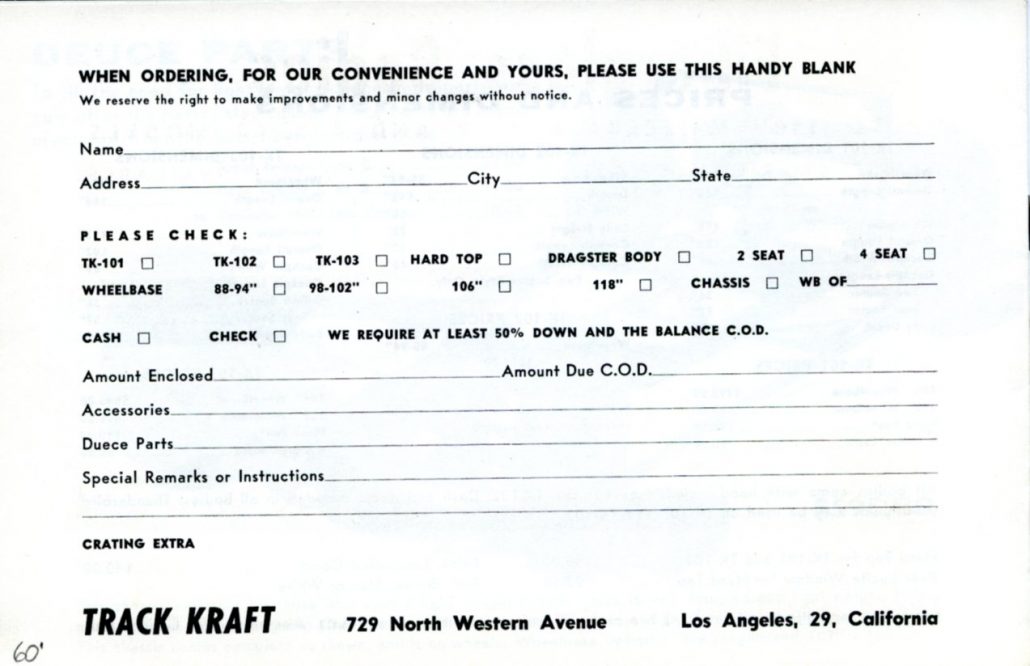 So this is what we know, and this is an opportunity for those of you interested to participate. Know of any articles? Find other ads? Other brochures? Did anyone buy a car body from this company? Any and all information you might have out there on Track Kraft is welcomed, and will help clarify the history of this interesting company. Paul Sable and I will thank you. Probably Rick D’Louhy too.