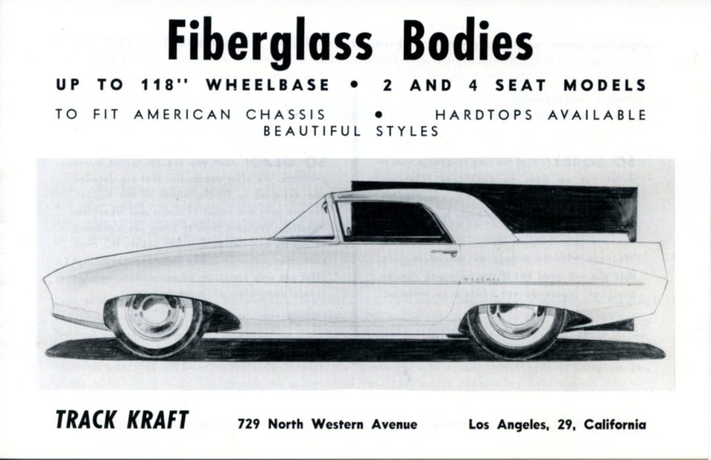 In researching almost every fiberglass company, Rick D’Louhy and I have been able to identify the principles and / or employees who worked for them, and identify their history too. However, Track Kraft has stubbornly refused to yield this information. Perhaps they did not last that long or make many – if any – cars. We are still researching their history via magazines (ads, stories, brochures), and have only found one ad, one brochure, and no stories. I believe I’ve seen more ads, so that may be forthcoming as we continue to push thru the early 1960’s magazines.