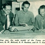 Caption: Looking over the scale model of the Venus are its creators, K. W. McLeod, E. F. Rockett, and D. Y. Gorman.
