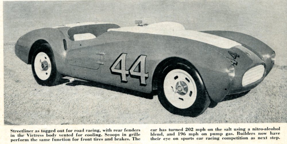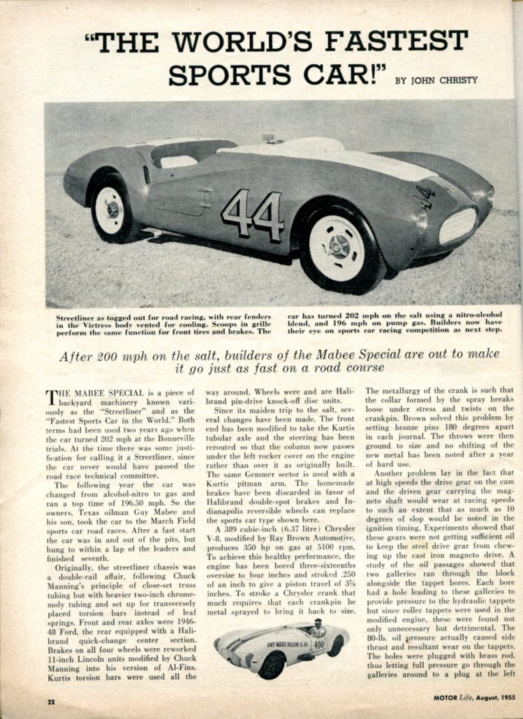 The Mabee Special is a piece of backyard machinery known variously as the “Streetliner” and as the “Fastest Sports Car in the World.” Both terms had been used two years ago when the car turned 202 mph at the Bonneville trials. At the time there was some justification for calling it a Streetliner, since the car never would have passed the road race technical committee.