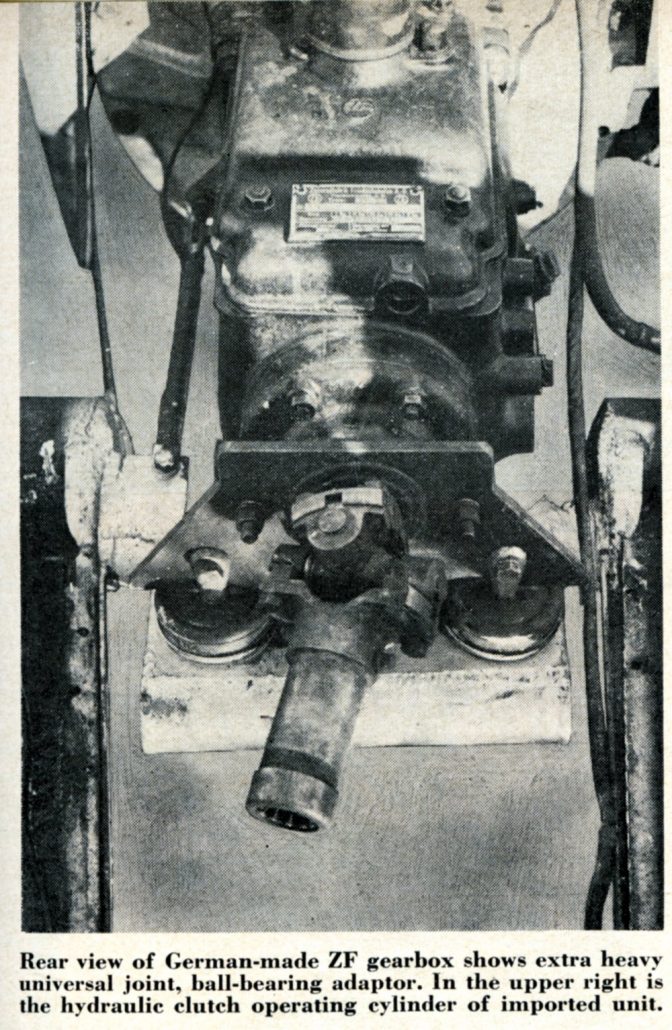 The German made ZF (Zahnradfabrik Friedrichshafen, A.G.) box was a later addition, installed when it was found that the Ford transmission, while sufficient for straightaway runs, was not beefy enough nor of close enough ratios for closed circuit road racing. Although expensive and not easy to acquire, the ZF box has for years been practically S.O.P. in Grand Prix due to its ruggedness and even ratios of 25 percent step-up between gears.