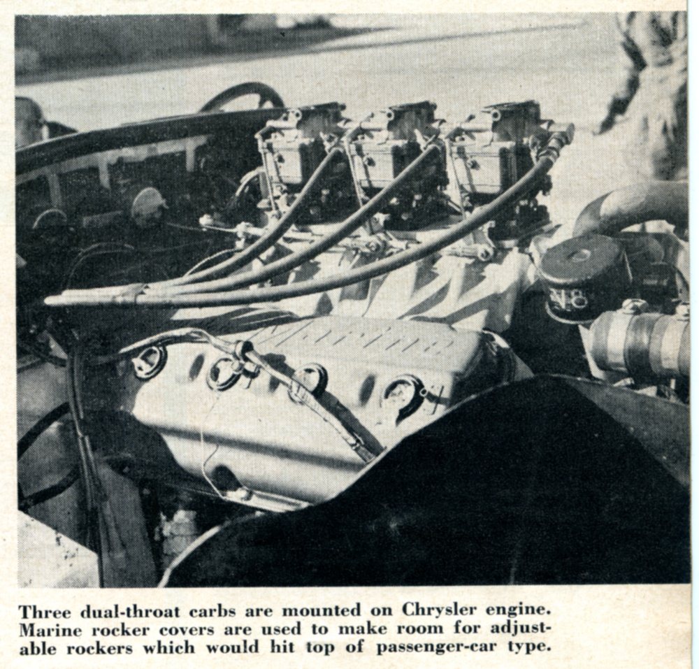 The heads were modified by cleaning out the ports and enlarging the intake valves to 2 1/16 inches. Sodium cooled valves were then set into big-bore bronze guides. Chrysler Marine rockers, which are adjustable, replace the stock items and are used with very light .058 wall chrome-moly push rods manufactured by Brown’s company.