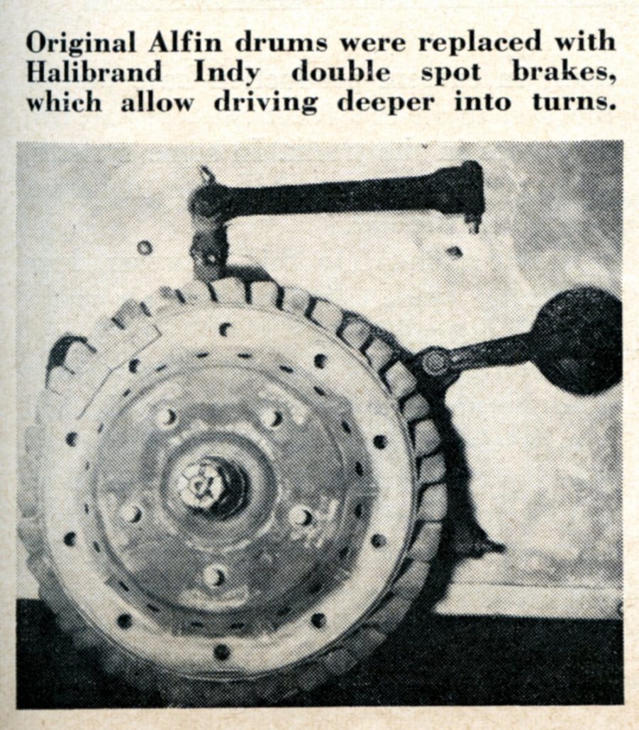 Since its maiden trip to the salt, several changes have been made. The front end has been modified to take the Kurtis tubular axle and the steering has been rerouted so that the column now passes under the left rocker cover on the engine rather than over it as originally built. The same Gemmer sector is used with a Kurtis pitman arm. The homemade brakes have been discarded in favor of Halibrand double-spot brakes and Indianapolis reversible wheels can replace the sports car type shown here.