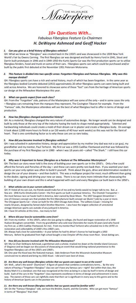 Rick D’Louhy and I are honored to co-chair the Fabulous Fiberglass event with good friend and noted automotive historian and car collector DeWayne Ashmead. In preparation for the “Fabulous Fiberglass” event, “The Masterpiece” put together an interview with us called “Ten Questions With… ” that is designed to help those who wish to learn more about vintage glass to get a good overview of these very special cars. Click here to review this document on the Masterpiece website. In addition, I’ve posted the information below for your review: