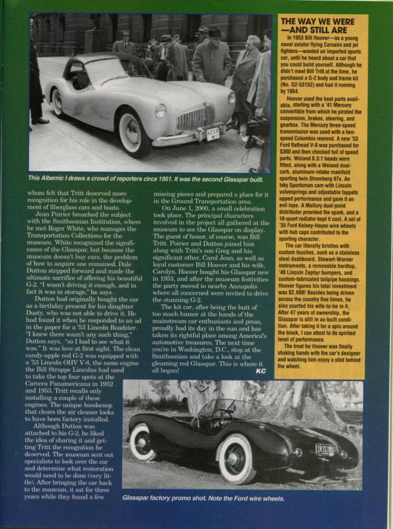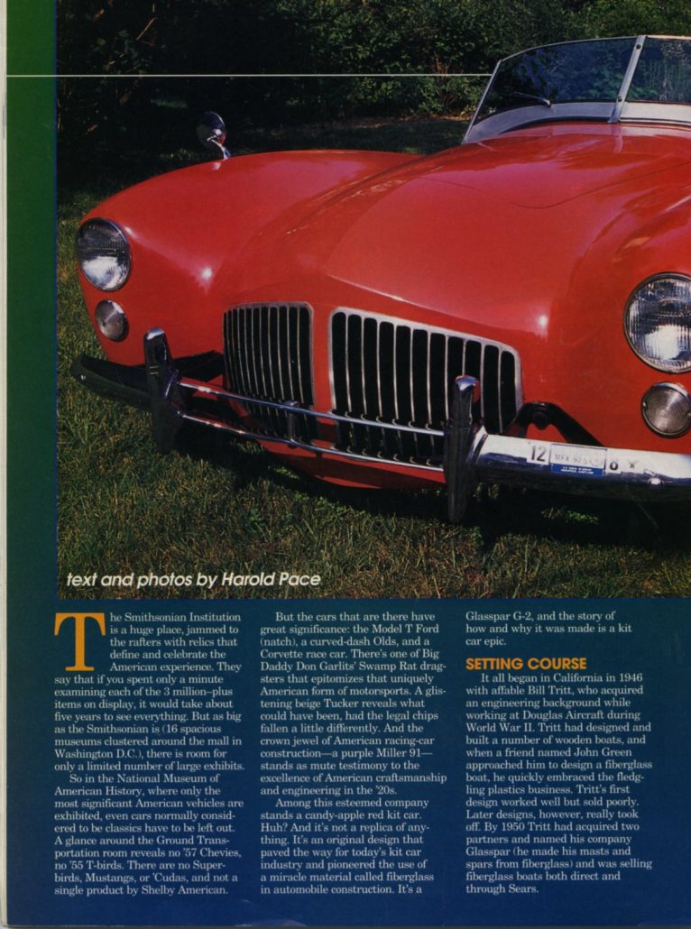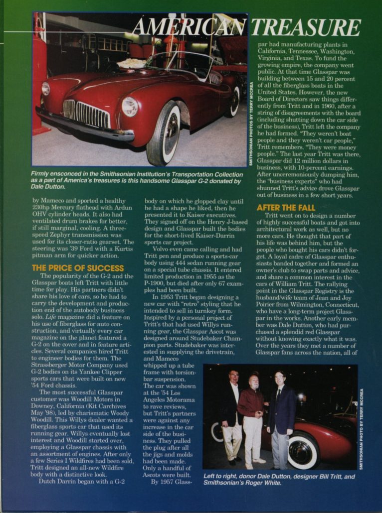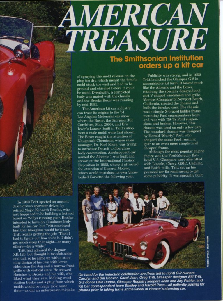 Concerning the donation of the Glasspar G2 to the Smithsonian Institute, the venerable Harold Pace wrote an excellent article back in January 2001 that discussed the acquisition of the Glasspar G2 and the celebration that occurred to mark the event on June 1st, 2000 – just over 10 years ago (wow!). The full article appears below, but allow me to share part of it that discusses the event at the Smithsonian in June 2000: