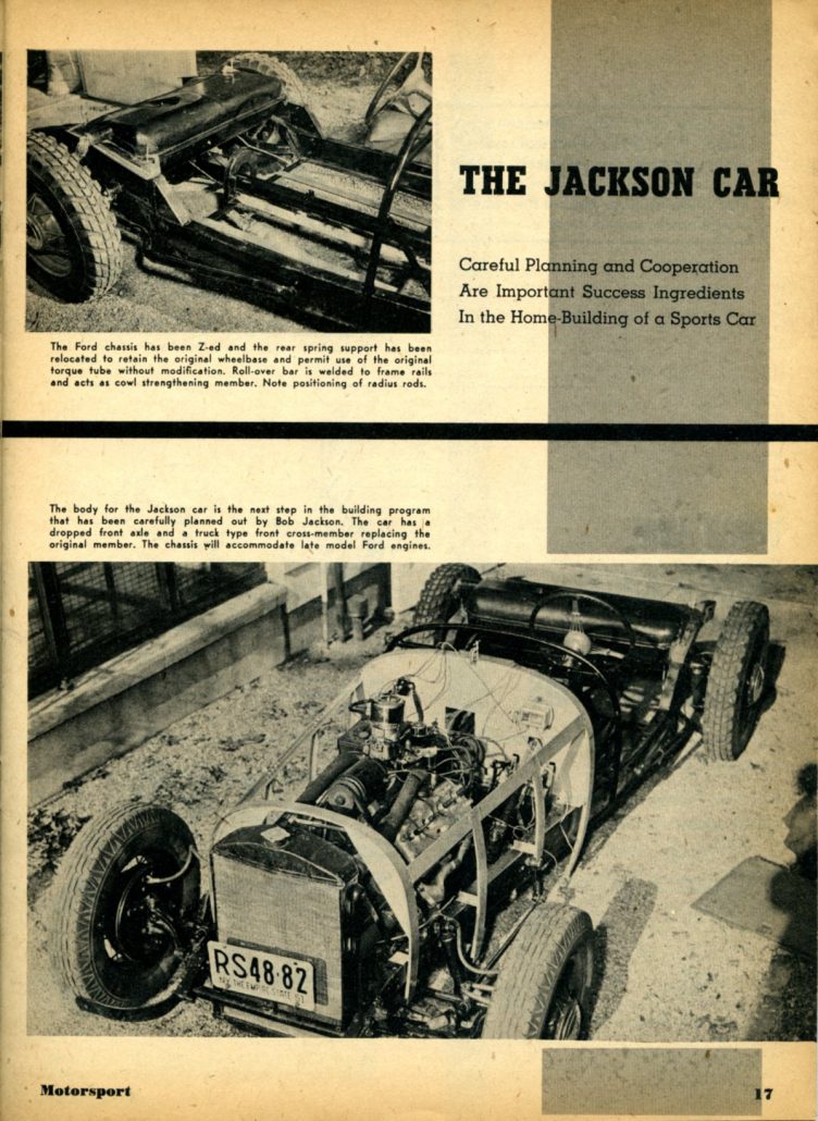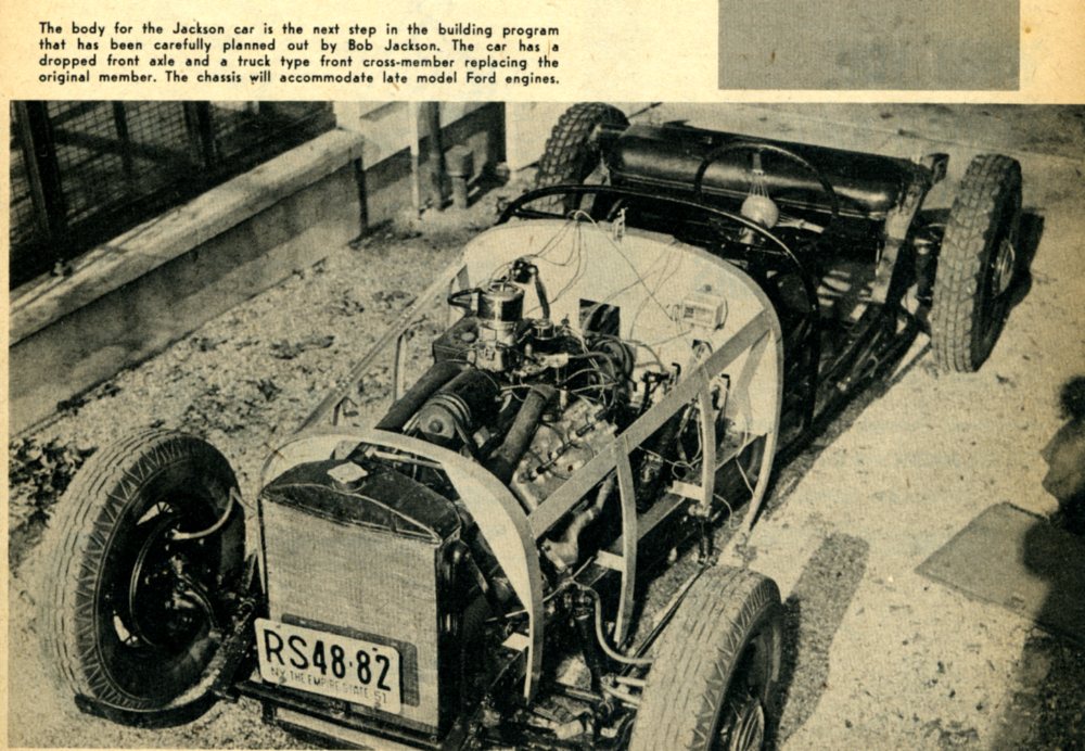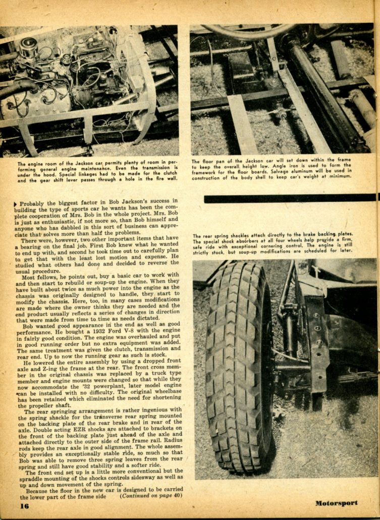 The more you dig into the magazines of the ‘50s, the more information you find. It’s like having multiple copies of the same issue – each time you go back and review the same issue….you find more. That’s what happened when I found today’s article about Bob Jackson and the progress he was making on building his own sports car.