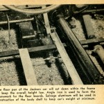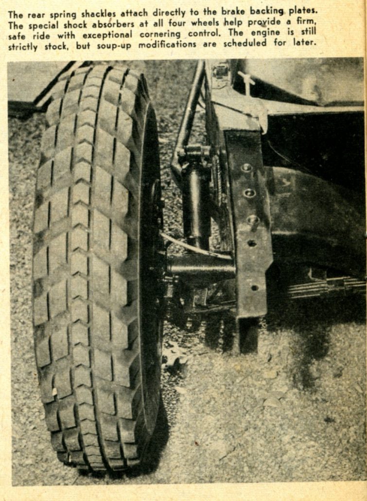 The front end set up is a little more conventional but the spraddle mounting of the shocks controls sidesway as well as up and down movement of the spring. Because the floor in the new car is designed to be carried the lower part of the frame side. Up to now, the changes made, in spite of the fact that the running gear is strictly stock have greatly improved the performance of the car, particularly in regard to its handling qualities.