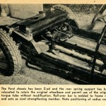 He lowered the entire assembly by using a dropped front axle and Z-ing the frame at the rear. The front cross member in the original chassis was replaced by a truck type member and engine mounts were changed so that while they now accommodate the ’32 powerplant, later model engine can be installed with no difficulty. The original wheelbase has been retained which eliminated the need for shortening the propeller shaft.