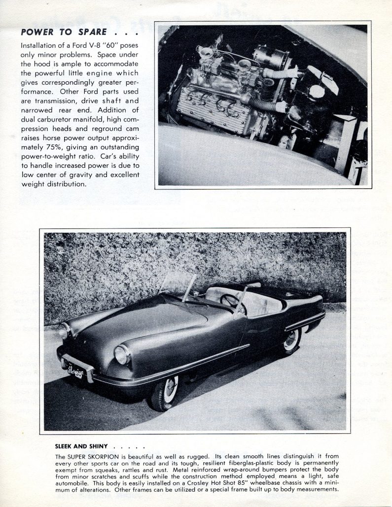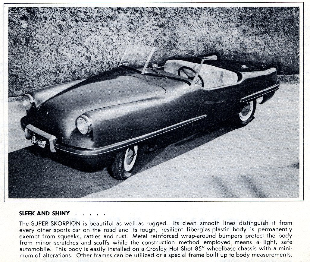 No other car on the road offers so many advanced design features at such a low cost. Built primarily for the Crosley Hot Shot chassis, the Super Skorpion body can be installed on any suitable 85” wheelbase frame. By using the Crosley chassis, of course, great savings can be made and a high performance sports car can be built for a fraction of the cost of a popular imported roadster.