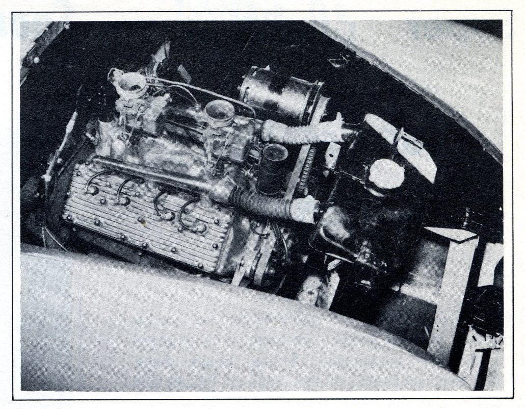 Installation of a Ford V8 “60” poses only minor problems. Space under the hood is ample to accommodate the powerful little engine which gives corresponding greater performance. Other Ford parts used are transmission, drive shaft and narrowed rear end.