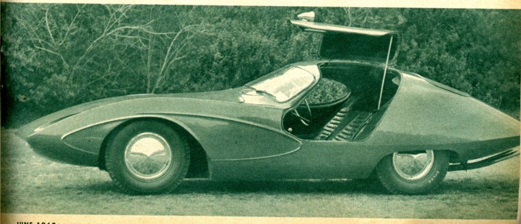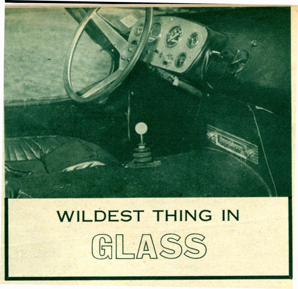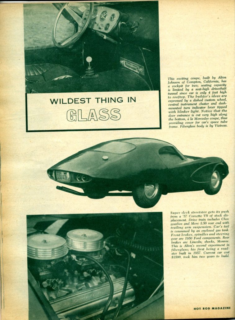 * This is Alton’s second experiment in fiberglass; his first being a roadster built in 1957. Current car cost $3500, took him two years to build.