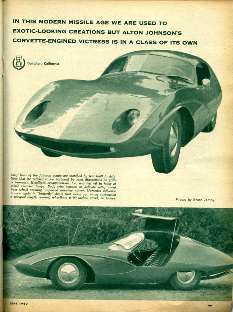 * Fiberglass body is by Victress. (Author Note: Alton Johnson was an Art center student and Victress employee who worked on his LeMans Coupe on the off hours at Victress. The car mold and bodies were actually built by Marvin Horton, Ed Monegan, and Alton Johnson. Alton built his car from the first body taken from the mold).