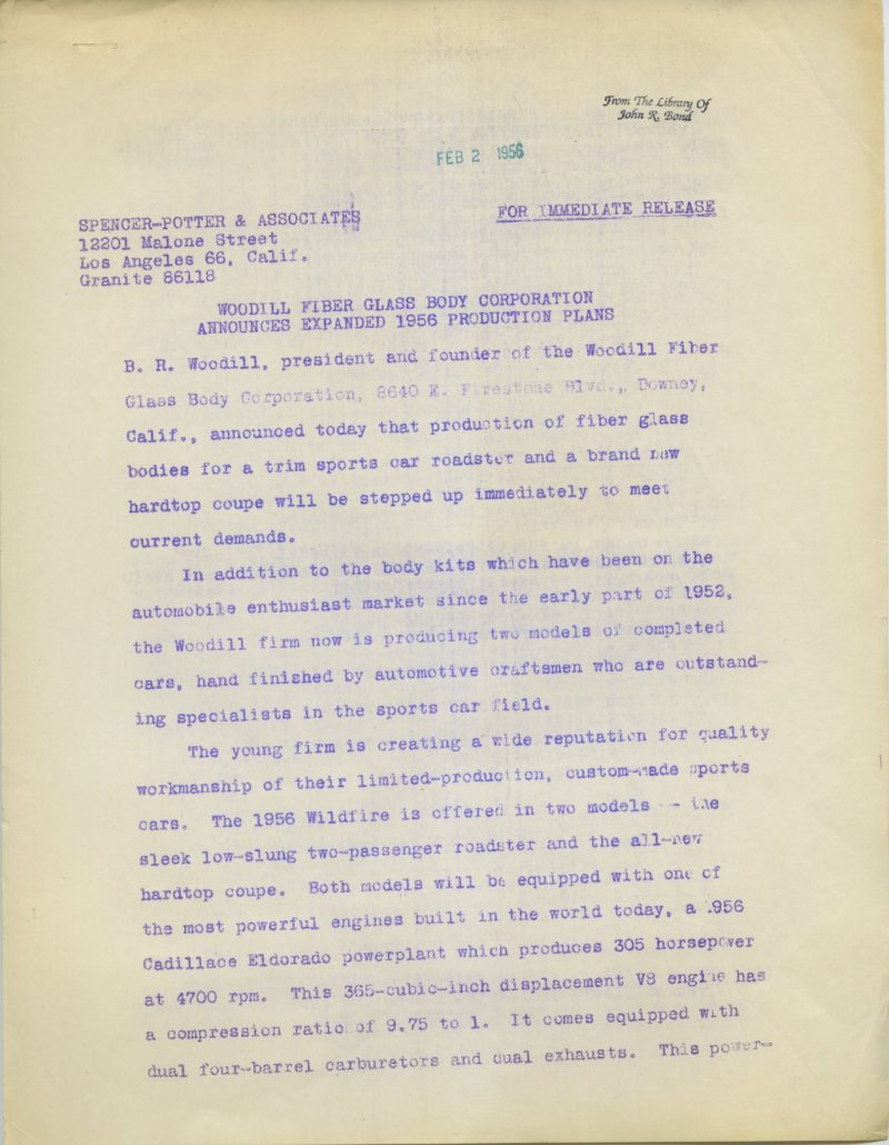 One minor correction to the press release – body kits were available as of the late summer of ’53 – not early ’51. The initial modified Glasspar body used by the first few Woodill Wildfire Sports Cars debuted at the Petersen Motorama in November ‘52. Just a minor correction needed.