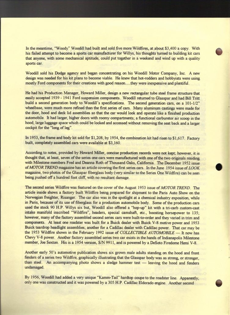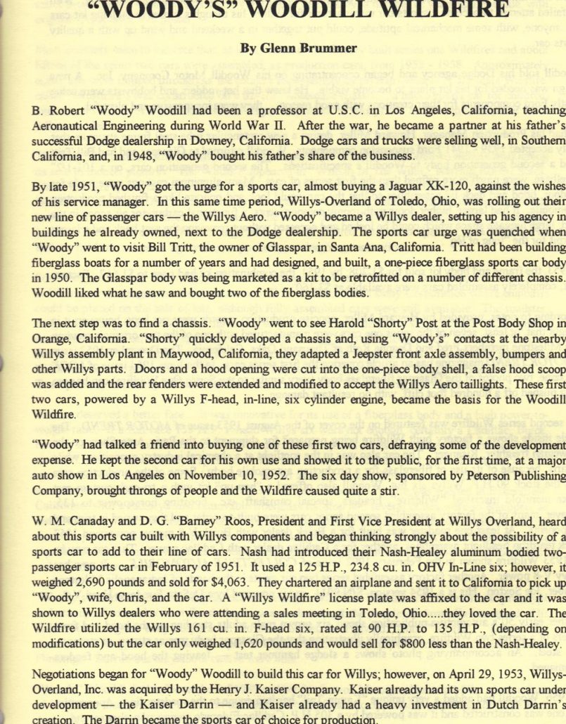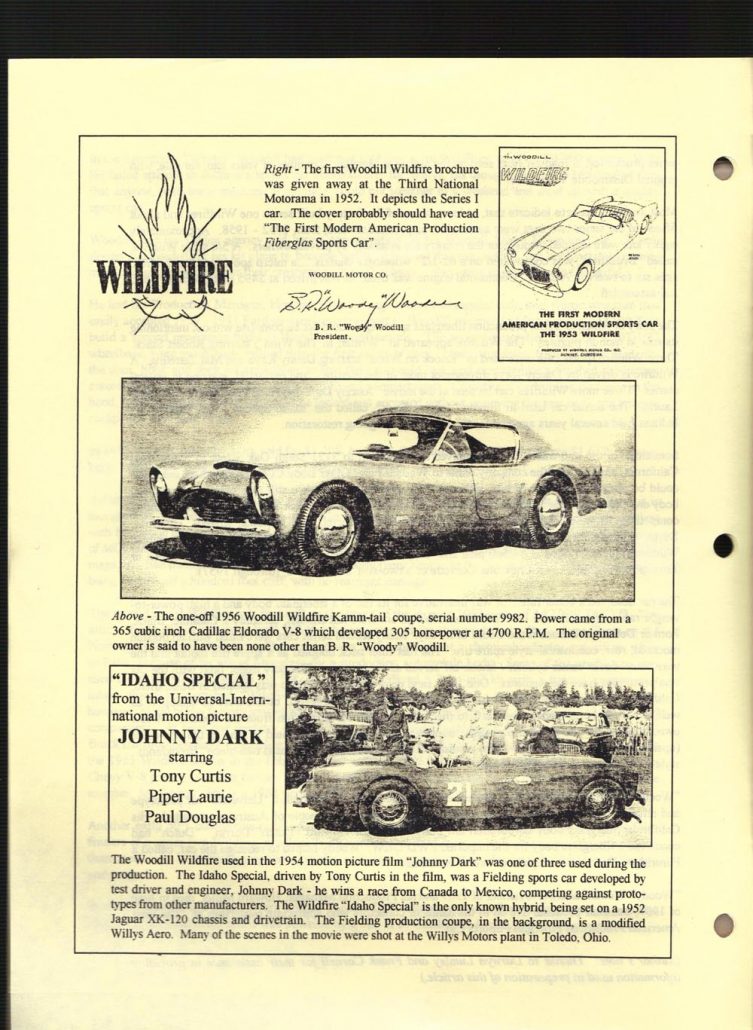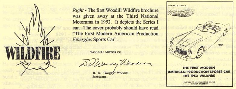 - Caption: The first Woodill Wildfire brochure was given away at the Third National Motorama in 1952. It depicts the Series I car. The cover probably should have read “The First Modern American Production Fiberglass Sports Car.”