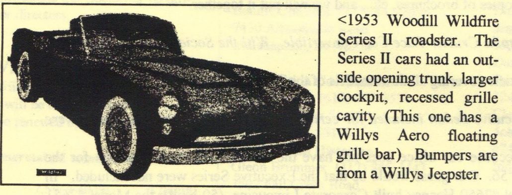 - Caption: 1953 Woodill Wildfire Series II Roadster. The Series II Cars Had An Outside Opening Trunk, Larger Cockpit, Recessed Grille Cavity (This One Has A Willys Aero Floating Grille Bar). Bumpers Are From A Willy Jeepster.