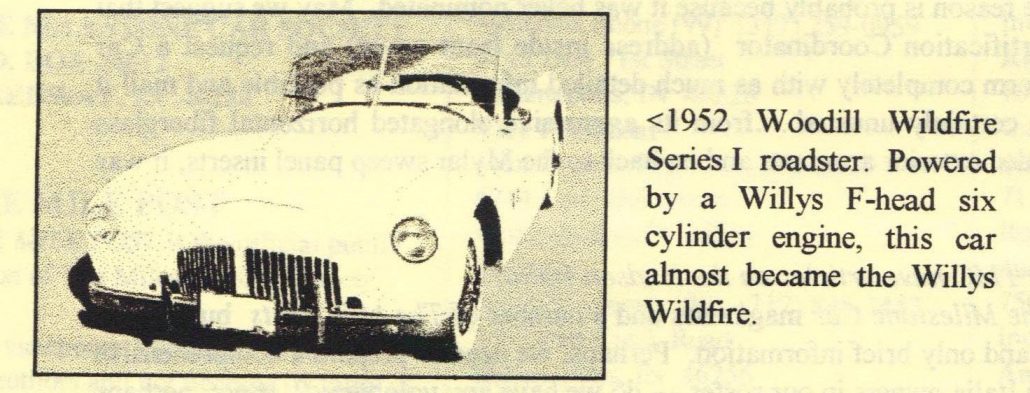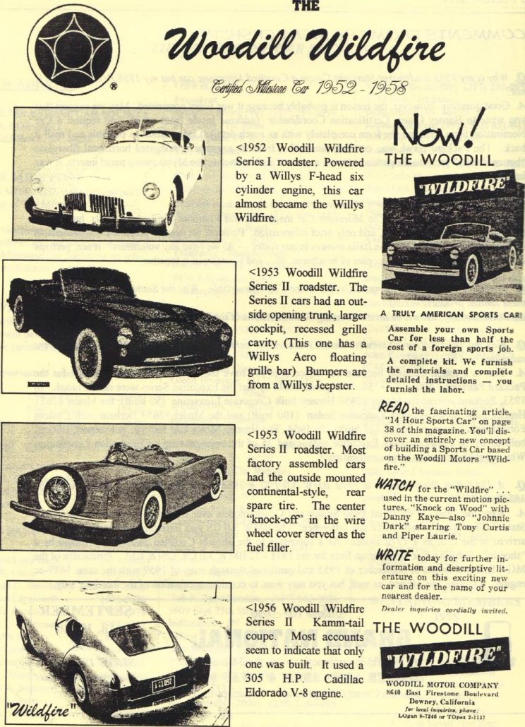 - Caption: 1952 Woodill Wildfire Series I Roadster. Powered by a Willys F-Head Six Cylinder Engine, This Car Almost Became the Willys Wildfire.