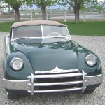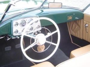 Champion differential and a modified 1948 Studebaker Champion front axle. The wheels were also Studebaker Champion wheels as were several other parts including the steering box. When the Studebaker engine failed to materialize, Kurtis accepted Bensen Ford’s offer and installed the Ford flathead engine, transmission and other parts in car number KB003 but retained the Studebaker suspension, differential and wheels, etc. because the car was partially build and awaiting the Studebaker engine to complete it. (Later cars use Ford suspensions, differentials and wheels.) The car was originally painted green with tan leather interior and tan top which was padded. Over its life in addition to the green color it has been painted white, black, purple, brown, and yellow.