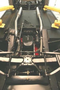A Stewart-Warner instrument panel with a full array of gages including a tachometer, adjustable leather bucket seats, plexiglass side curtains, floor gearshift and a Warner Gear overdrive were all standard equipment. Both the hood and rear deck lid were opened from inside the car. The 239 cid Ford V-8 engine was modified using Edelbrock heads, Spaulding dual ignition, Offenhauser intake with two Stromberg carburetors, a hotter camshaft and Fenton exhaust headers. The pistons and crankshaft were sourced from Mercury engines. The bore was 3 5/16 inches, the stroke 4 inches and compression 10.5:1. A Ford truck oil pan was used because it held an extra quart of oil. Most of the cars had a Ford truck differential housing which was much stronger than the automobile unit in order to withstand the greater torque of the modified engine. Although 95% of the car was sourced from stock production-car items, they were carefully packaged for maximum