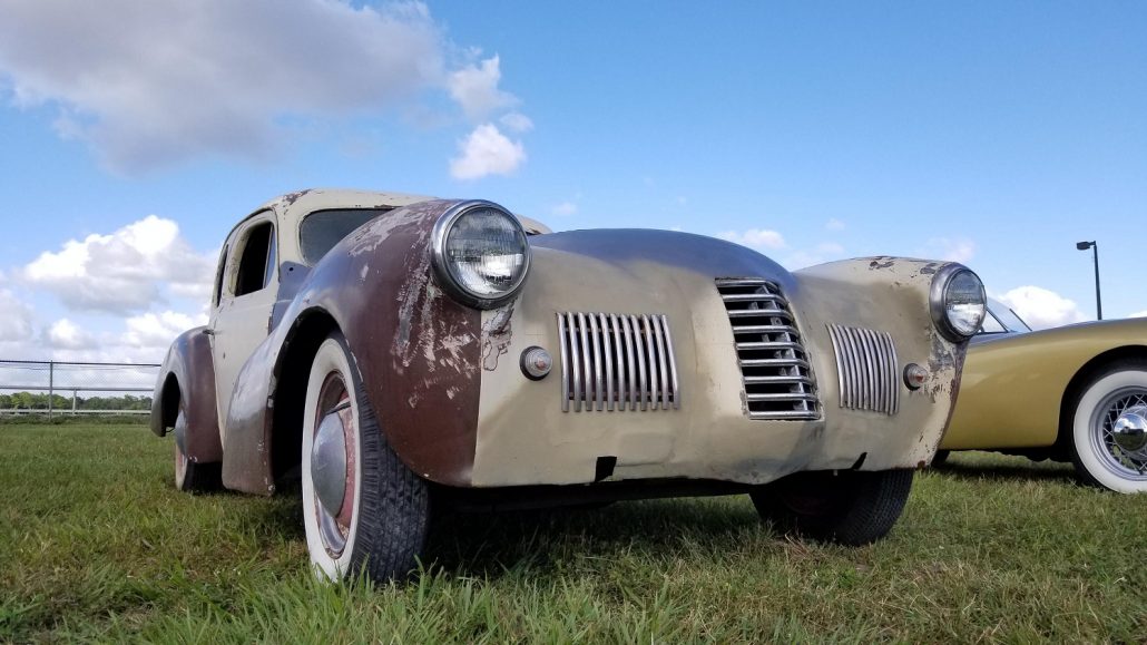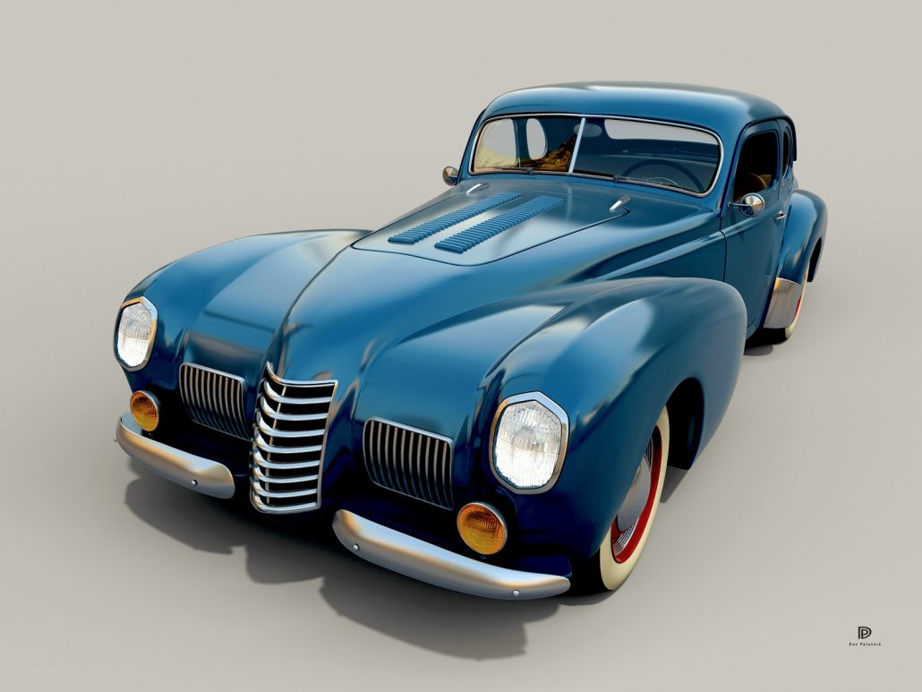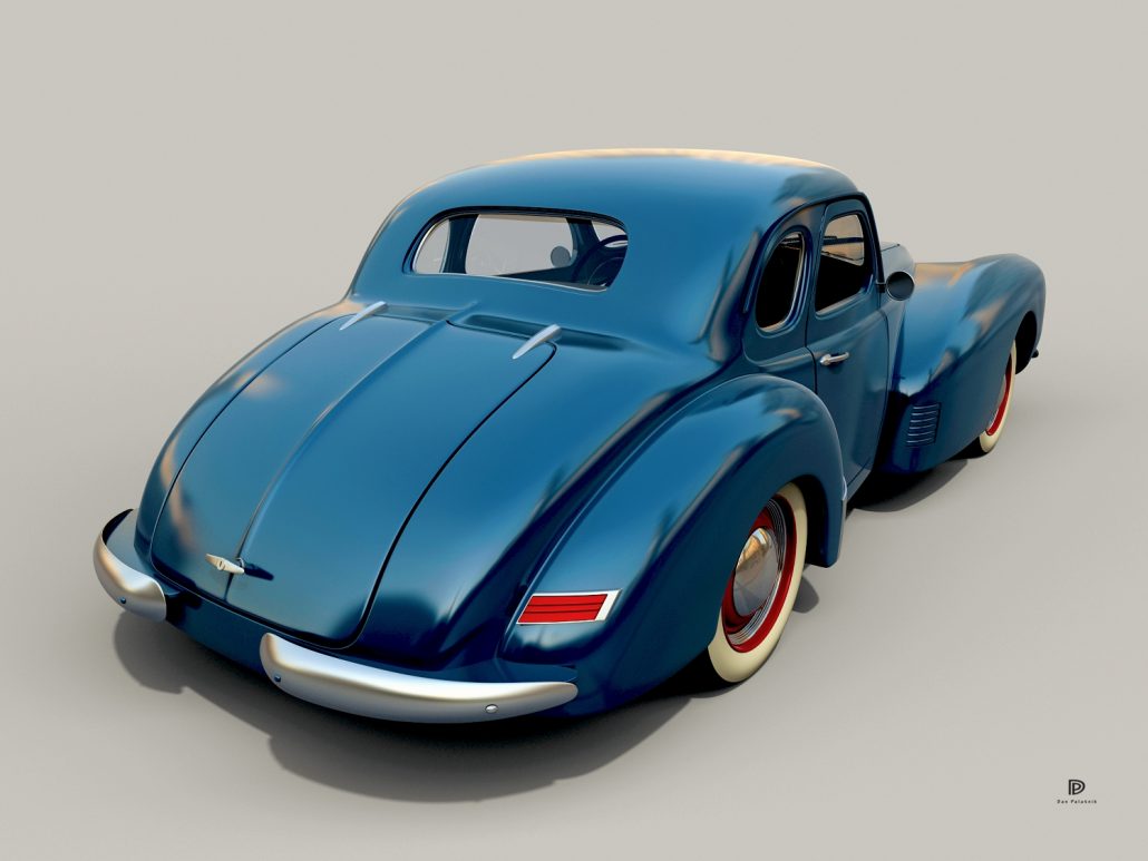 - Cab and rear was 1938 Plymouth Coupe, chopped and channeled. Front fenders were from donor car – 1939 Nash 4 door sedan – chopped and extended 14 inches with extensive molding of fenders.