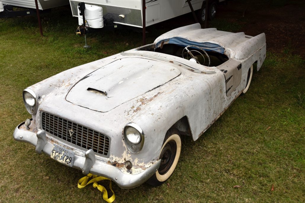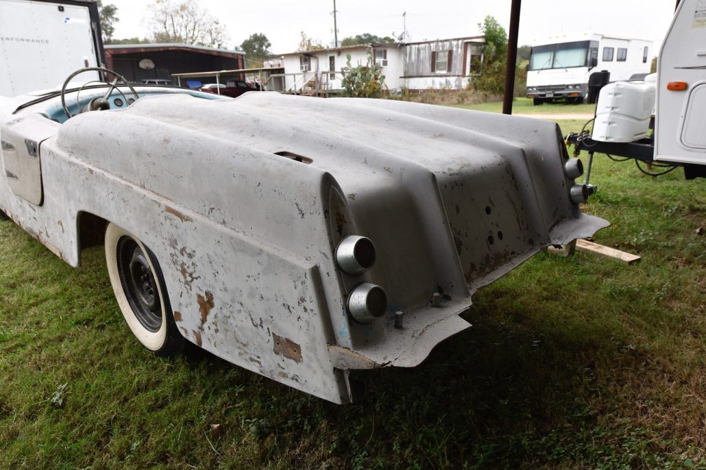 That was when he started finding out more about the cars his now-deceased father had built. It turns out there were two grill configurations, one with a central vertical bar and four spears radiating outward, and a second with a squared-off egg-crate grill. At least one sported a Continental kit on the back to hold a spare tire. All had large external door hinges and 1952 Ford bumpers (narrowed 3” in the rear). The tall tail lights were borrowed from a ’52 Packard and the teardrop head lamps were courtesy of a ‘53 Buick. The thick, sturdy ‘glass body weighed in at 395 pounds and the completed cars was expected to weigh in at 2,590 pounds dry (depending on engine and accessories).