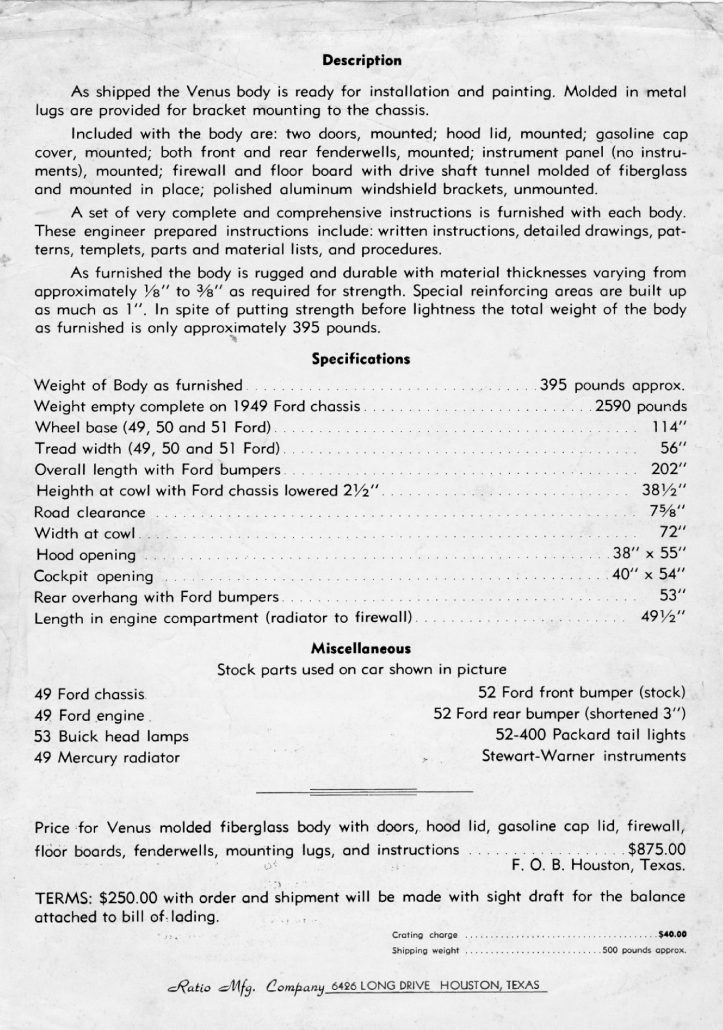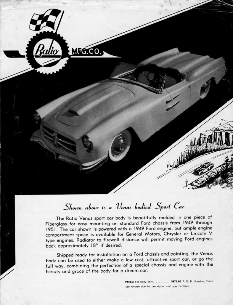 The first model was named the Venus, and it was a looker. It was a two-seat sports car with no top or side windows. The fiberglass bodies were designed to sit on full-length (114” wheelbase) 1949 to 1951 Ford chassis and were priced at $875. The Venus sales flyer revealed that any Detroit V-8 would fit under the long hood and that the engine could be moved back 18”. The body included two mounted doors, a mounted hood, instrument panel, firewall, floor boards and polished aluminum windshield posts. Ratio also offered to assemble turnkey cars for buyers who didn’t want to build one themselves.