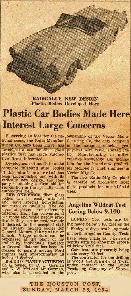 Ken McLoad was a hard-core car enthusiast who wanted to design and build his own car. Nothing unusual in that, there are thousands who constantly think and talk about their dream car project. The difference is that McLoad actually built his. He started the design work in the late 1940s when he was a young geophysical engineer in Dallas, Texas, and when he moved to Houston in 1950 he took the idea with him. He spent the next few years finalizing the details and gathered up two partners, D.Y Gorman and E.F. Rockett, to help bring the project to fruition. Gorman brought business expertise to the operation while Rockett was an experienced pattern maker. Gorman’s teenage son DeWitt also pitched in when the prototype was built. In 1954 the partners formed Ratio Manufacturing Company in Houston and set about launching their new kit car venture.