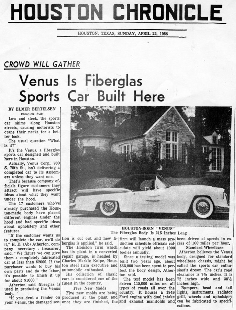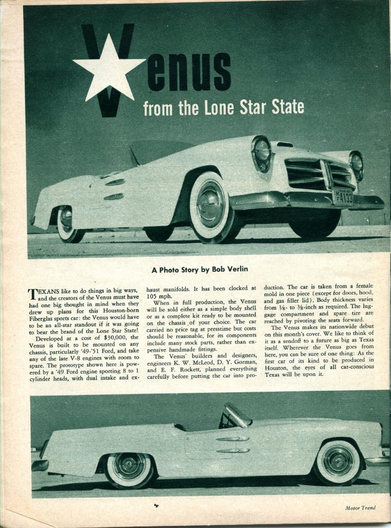 It was during the research phase of his project that McLoad located Jack Kovar, son of Eddie Kovar who had been a partner in the Venus Corporation. Not only did Kovar have stacks of photos and documents relating to the Venus, he even had a car of his own he picked up in 1965 from an ad in the Auto Trader! It was also undergoing a thorough restoration. Remarkably, both Venus owners live in the Houston area and hopefully the two surviving fiberglass goddesses will soon be making their owners’ dreams come true!