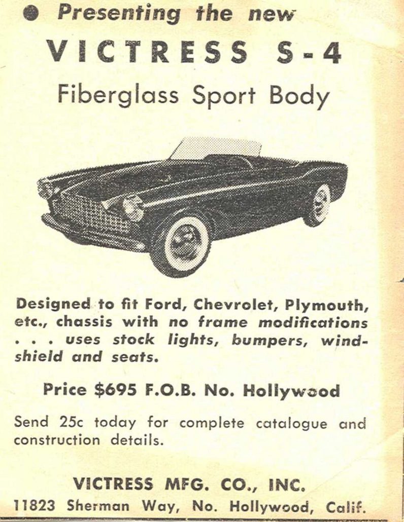 The Victress S4 came out in 1954 and was designed to be built on an unmodified chassis of the era. The typical wheelbase of sports cars at the time were either 94 inches or around 100 inches. The Victress S4 was designed to fit a variety available chassis at the time all with a wheelbase of around 114” – give or take a few inches.