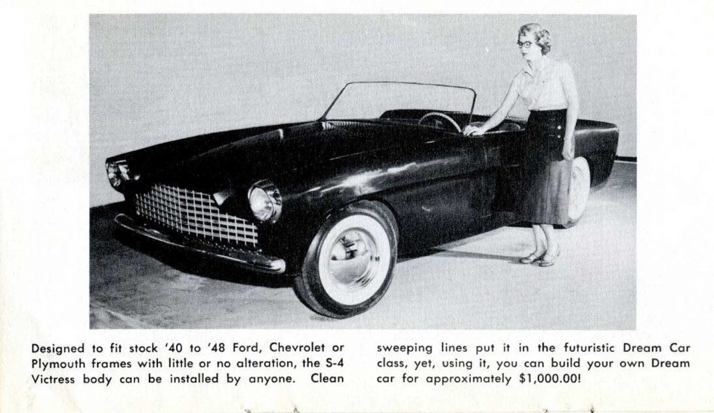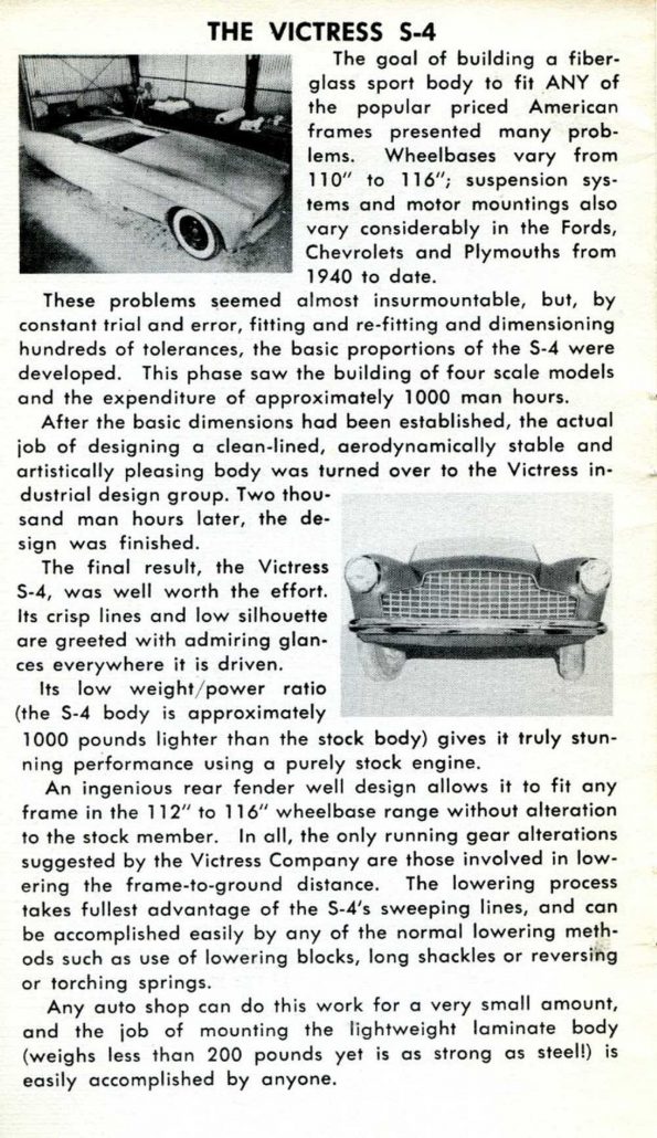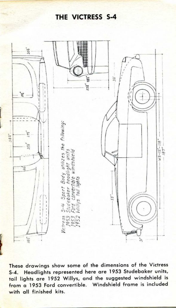 The Victress S4 came out in 1954 and was designed to be built on an unmodified chassis of the era. The typical wheelbase of sports cars at the time were either 94 inches or around 100 inches. The Victress S4 was designed to fit a variety available chassis at the time all with a wheelbase of around 114” – give or take a few inches.