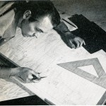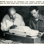 When he has decided upon the final design sketch, the student then makes a three-view color rendering to proper scale.  Criticism by the instructor is given on each step.  This helps iron out many problems.  Using the three-view drawing on vellum, the surfaces are next developed and sections are made for wood templates.  The clay model is then built to prove the student’s design in three dimensions which is final proof his design is okay.