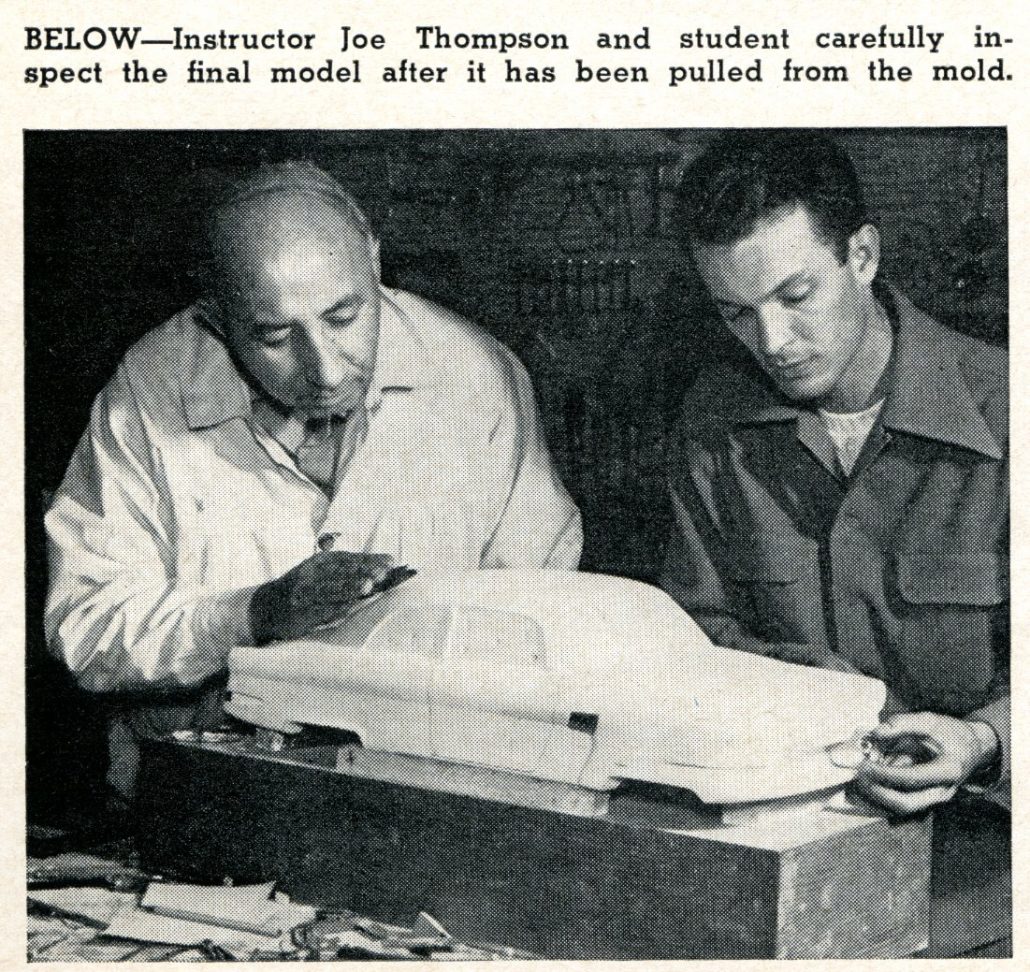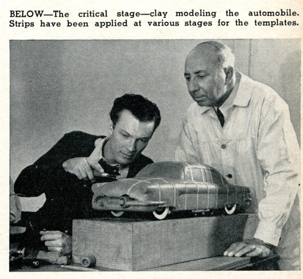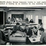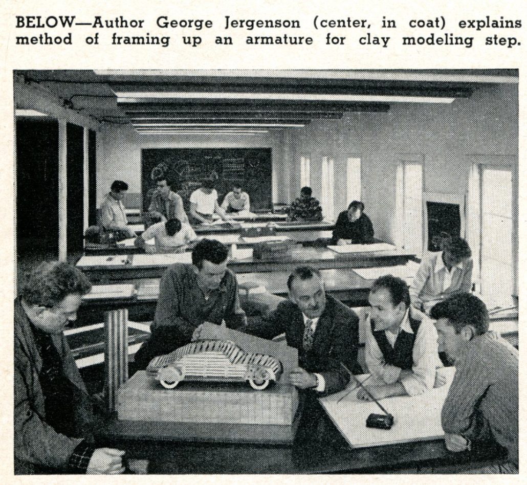 4. When this article was done Joe Thompson had only been there a short time. He had worked for Raymond Lowey at Studebaker on their 1947 cars. George Jergenson was an early member of Harley Earl’s design department at GM. He worked on the 1938+ Cadillac 60 special under Bill Mitchell. The war years put many designers out of jobs when car production stopped in 1942. Joe was likely 62 or 63 at this point. He was still going strong 11 years later when I got there, and lived into his 90s. He was said to be America’s second auomotive clay modeler. For many years he was manager of Cadillac’s Sample Body Department [their porto-type shop]. This was long before computers converted drawings into body dies. He developed patterns much as guys did their bucks for early fiber glass bodies – lots of assembled templates.