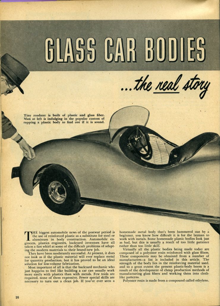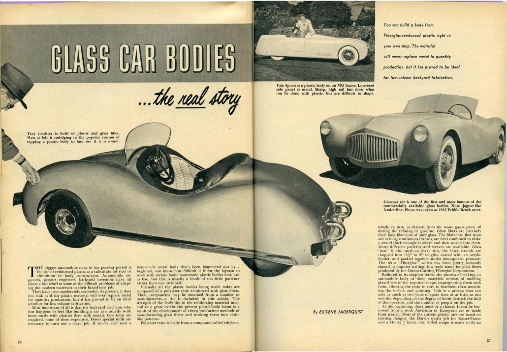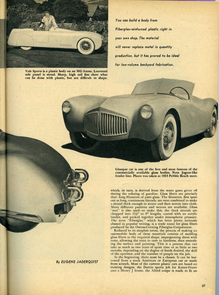 Alden and I have been working on a variety of fiberglass research projects and recently he sent me an excellent article which we both did not know the source. The race was on….. and within a short time, we identified it as coming from a short-run magazine called “Sports Cars and Hot Rods” published by the editors of Mechanix Illustrated in October 1953.