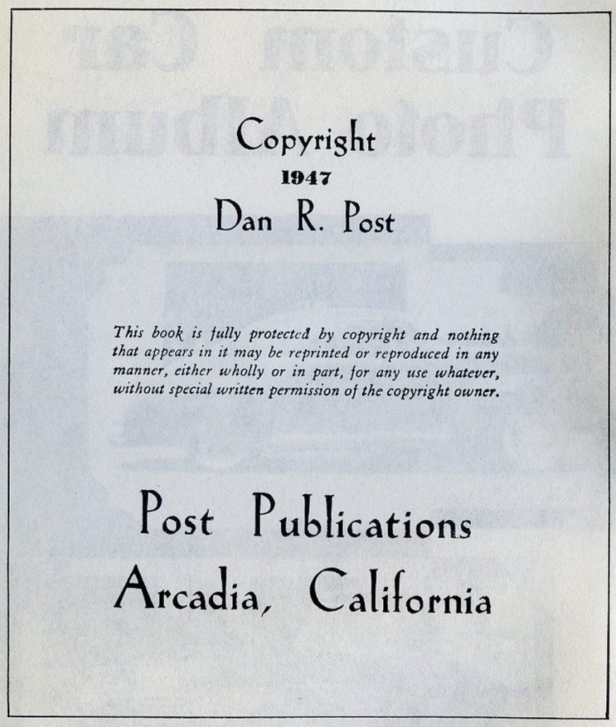 The Dan Post Custom Car Publications captures the birth of customizing a car in early postwar America. There were other publishing companies that produced a limited number of documents such as Almquist and Clymers, but Dan Post was first, he produced the largest number of documents from 1944 thru 1954 and was involved and showed some of the best work done by Sam/George Barris, Jimmy Summers, Coachcraft, Gil Ayalo, Valley Customs, Jerry Huth, Frank Kurtis and others.