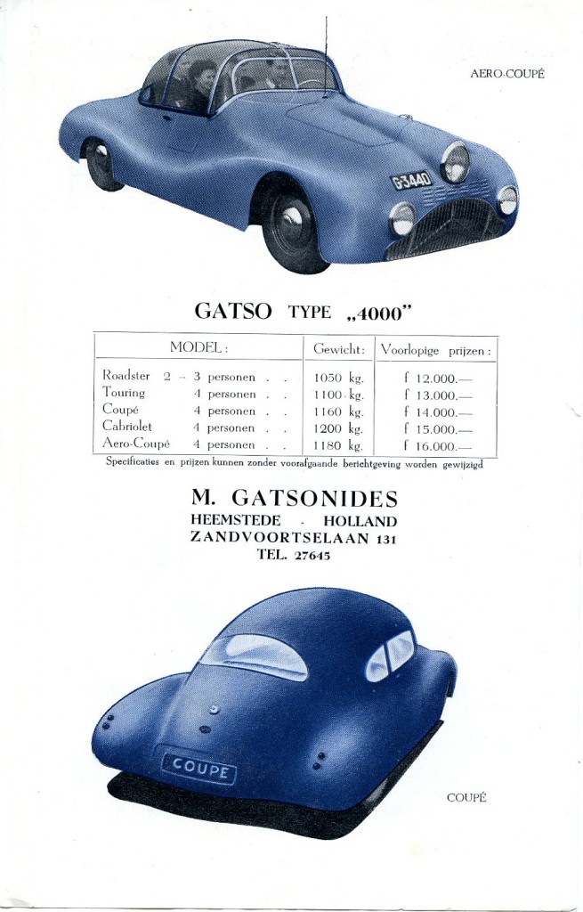 By July of 1948, the date of today’s brochure, the company’s name had changed their name from Gatford to Gatso and a host of new models were proposed.  Within a span of just a year, Maurice Gatsonides had expanded his offering from two models (sports roadster and aero coupe) to five models as follows: