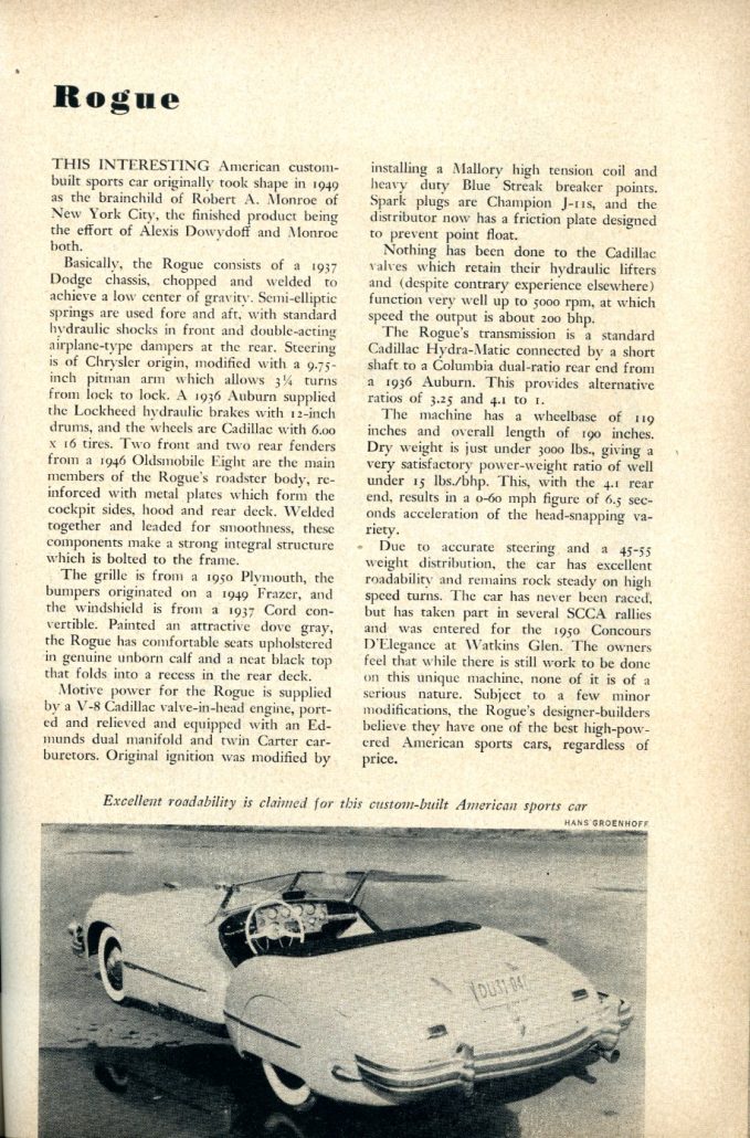 This interesting American custom-built sports car originally took shape in 1949 as brainchild of Robert A. Monroe of New York City, the finished product being the effort of Alexis Dowydoff and Monroe both.