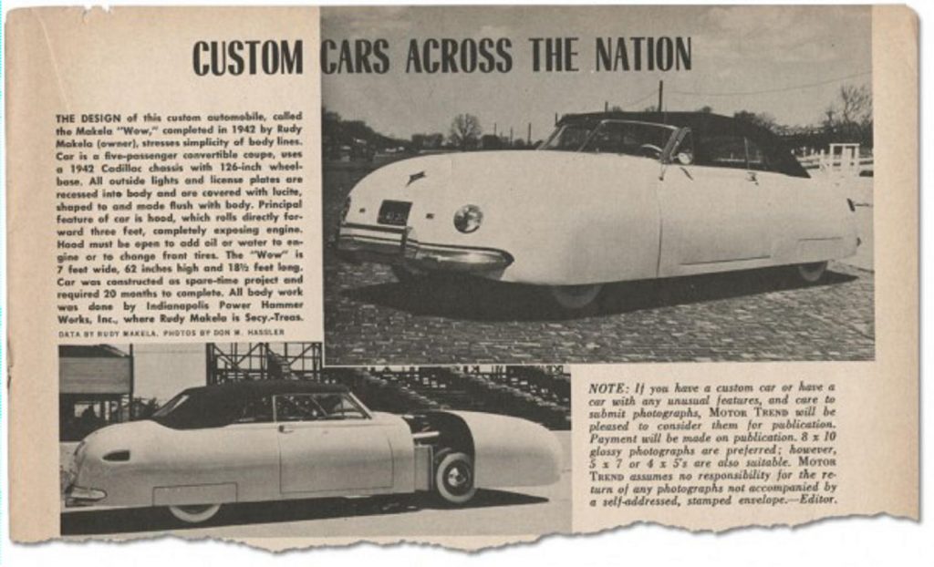 CCC-rudy-makela-caddy-02-W-602×366 Published May 13, 2020 at 1030 × 626 in Rudy Makela’s 1950 WOW Cadillac – One of America’s Earliest Custom Cadillacs The August issue of Motor Trend magazine used the photos that were later also used in the Custom Cars #101 booklet. This article also descriped the “WOW” Cadillac as being a 1941 Cadillac.