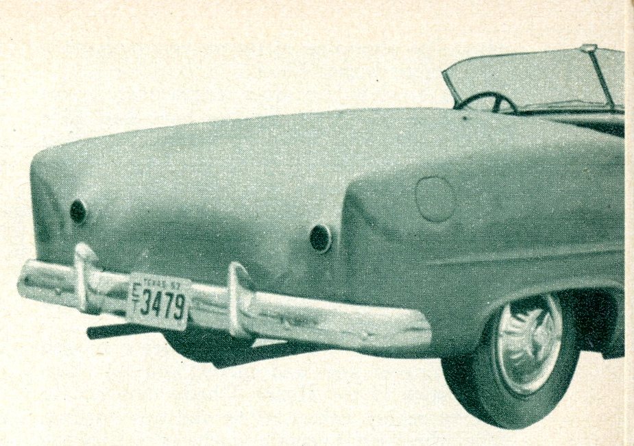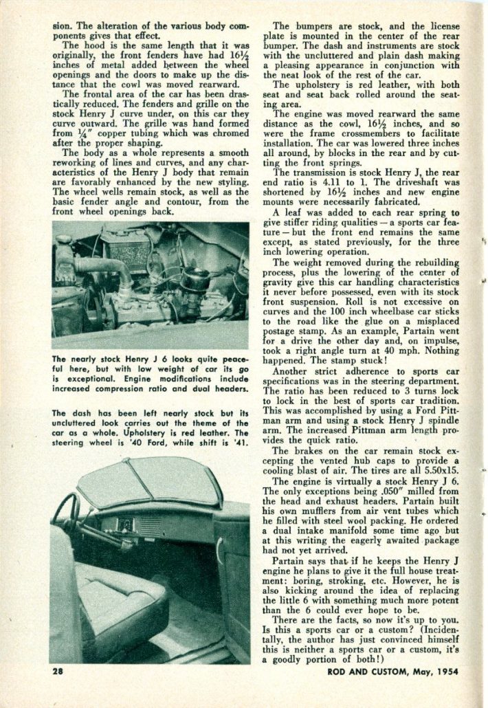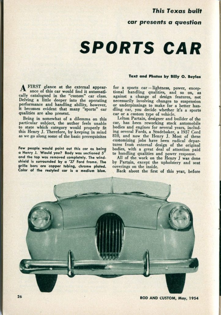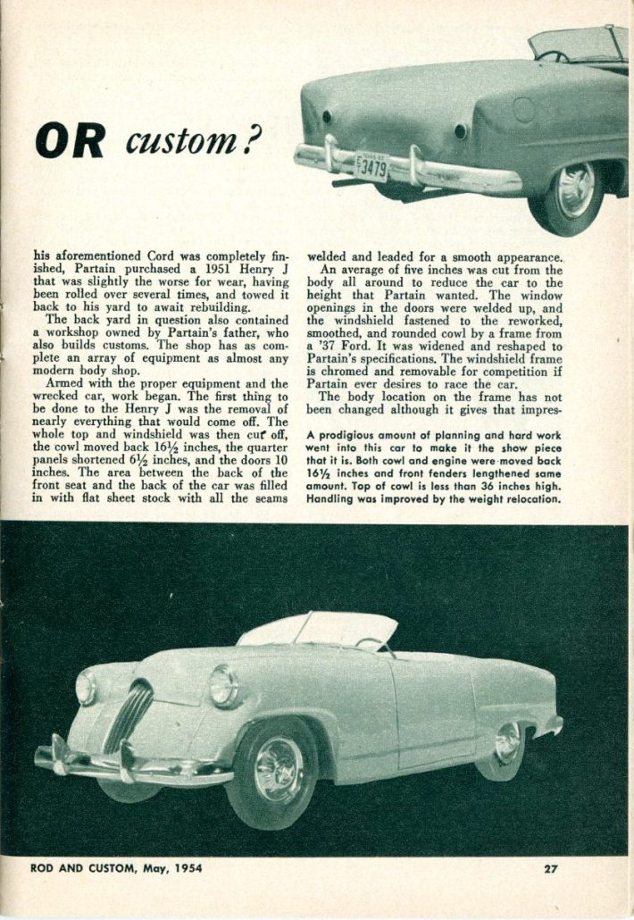 Lelton Partain, designer and builder of the car, has been reworking stock automobile bodies and engines for several years, including several Fords, a Studebaker, a 1937 Cord 810, and now the Henry J.  Most of these customizing jobs have been radical departures from external design of the original bodies, with a great deal of attention paid to handling qualities and power response.