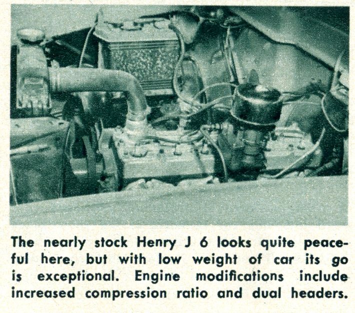 The engine is virtually a stock Henry J 6.  The only exceptions being .050” milled from the head and exhaust headers.  Partain built his own mufflers from air vent tubes which he filled with steel wool packing.  He ordered a dual intake manifold some time ago, but at this writing the eagerly awaited package had not yet arrived.