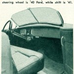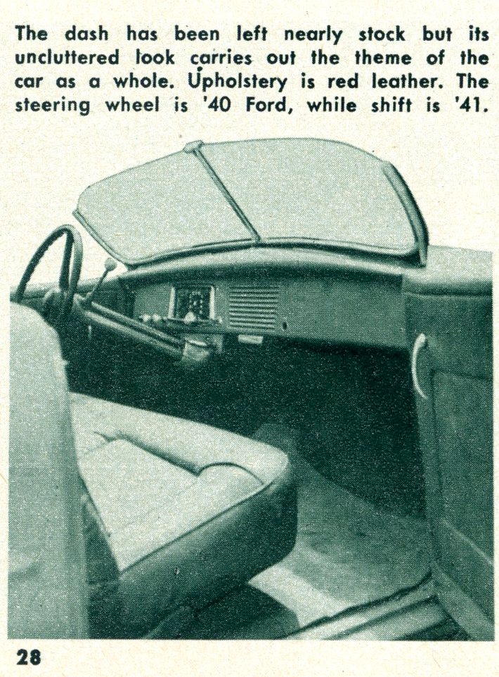 Caption: Thedash has been left neary stock but its uncluttered look carries out the theme of the car as a whole. Upholstery is red leather. The steering wheel is ’40 Ford, while shift is ’41.