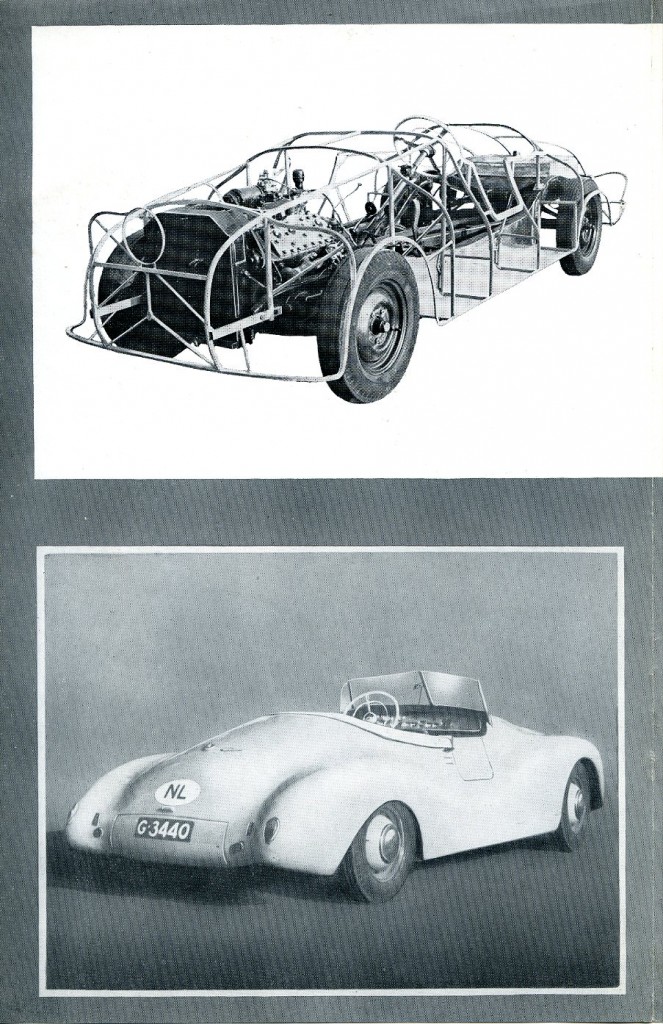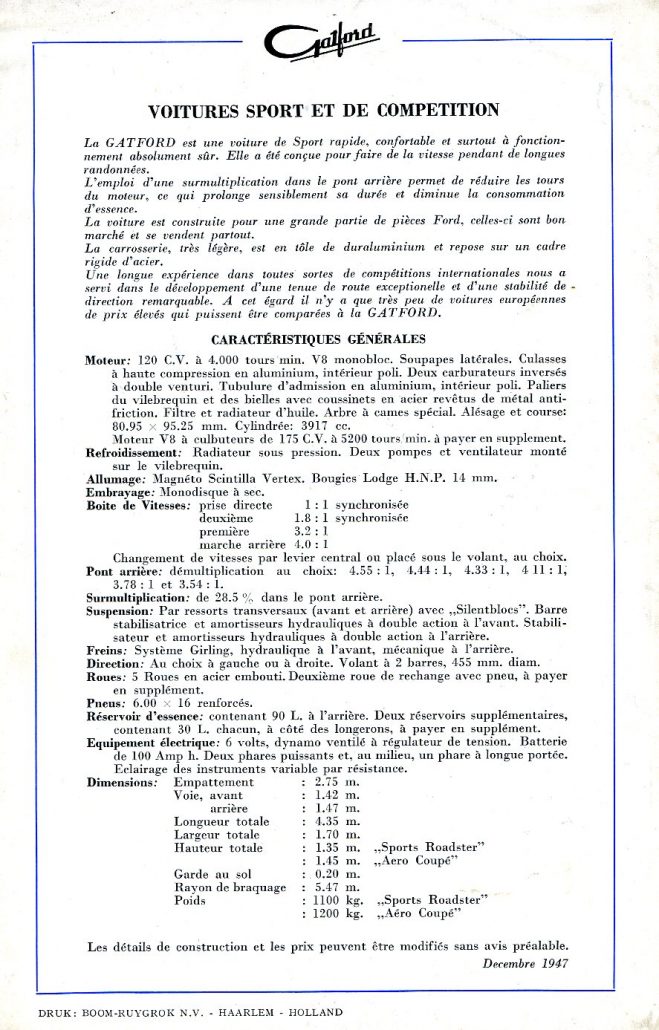 The GATFORD is a fast, comfortable and above all a reliable Sportscar, designed to be driven for a long time at high average speeds. By means of a dual ratio back axle the revolutions of the engine can be kept quite low, which improves its durability considerably while a low petrol consumption is obtained.  The car itself is chiefly built from Ford parts, which are obtainable everywhere at reasonable cost.  The very light body is built of duraluminium attached to a rigid steel frame. As a result of years of experience gained in all kinds of international competitions, a very good road holding has been obtained, coupled with remarkable good steering.  The driving qualities are only equaled by those of a few high priced European cars.