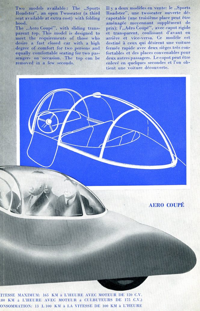 Two models available:  The “Sports Roadster” an open two-seater (a third seat available at extra cost) with folding hood.  The “Aero Coupe,” with sliding transparent top.  This model is designed to meet the requirements of those who desire a fast closed car with a high degree of comfort for two persons and equally comfortable seating for two passengers on occasion.  The top can be removed in a few seconds.