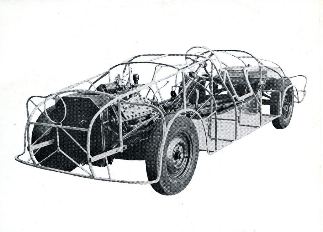 Perhaps the most striking feature however was the third head-light placed centrally above the radiator grille. This had come about due to the need for an extremely low bonnet line at the front of the car, whilst further back needing to clear the carburetors mounted in the V of the V8 engine.