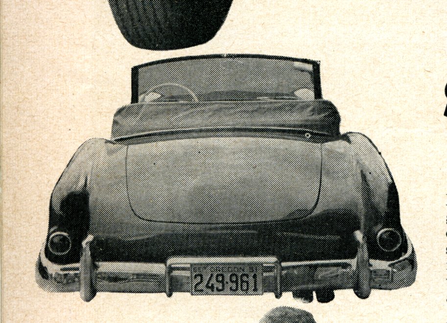 Wrap-around type bumpers, both front and rear, provide good protection against the well-known American “bumper-bump” type of driver. Styling follows the Italian school with the low flat hood and high fender line. The top, roadster style, is somewhat high but has enough headroom for a six-footer. It is white and may be lowered or removed completely and stored.