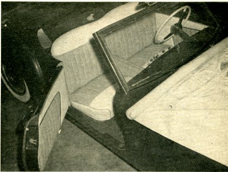 The drive shaft tunnel is used as a central armrest. For high speed work a built-in grab-bar is provided the passenger. Sound deadening material has been sprayed onto the bottom and interior of the body. To reduce rattles the hood has also been sprayed.