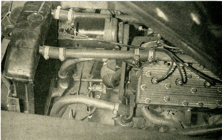 The engine is a modified Ford V8 60 which stables 113 fast horses. With Offenhauser heads, the compression ratio is 10.5 to 1. Twin carburetors are used on a dual manifold. The powerplant is mounted sixteen inches back from the front of the frame to insure proper balance and good traction on the rear wheels.