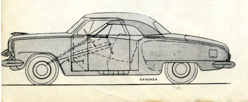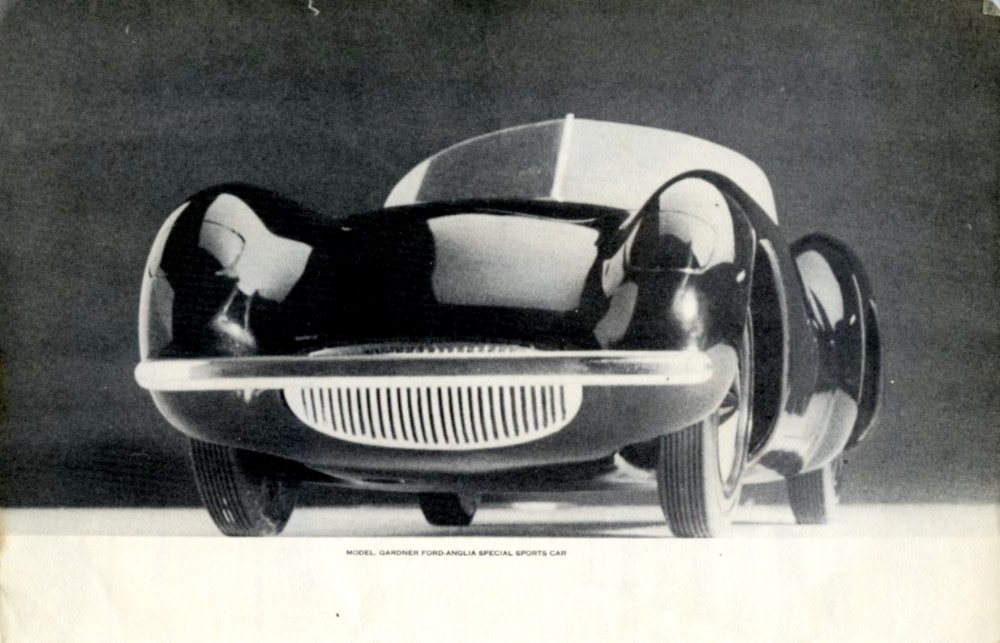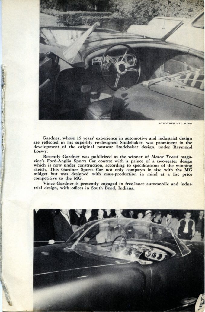 Gardner, whose 15 years’ experience in automotive and industrial design are reflected in his superbly re-designed Studebaker, was prominent in the development of the original postwar Studebaker design, under Raymond Loewy. Recently, Gardner was publicized as the winner of Motor Trend Magazine’s Ford-Anglia Sports Car contest with a prince of a two-seater design which is now under construction, according to the specifications of the winning sketch.