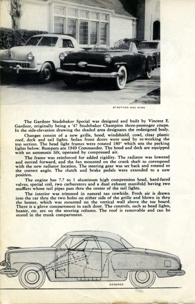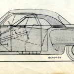 The Gardner Studebaker Special was designed and built by Vincent E. Gardner, originally being a ’47 Studebaker Champion three-passenger coupe. In the side elevation drawing the shaded area designates the redesigned body.