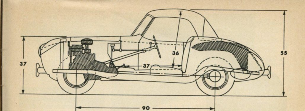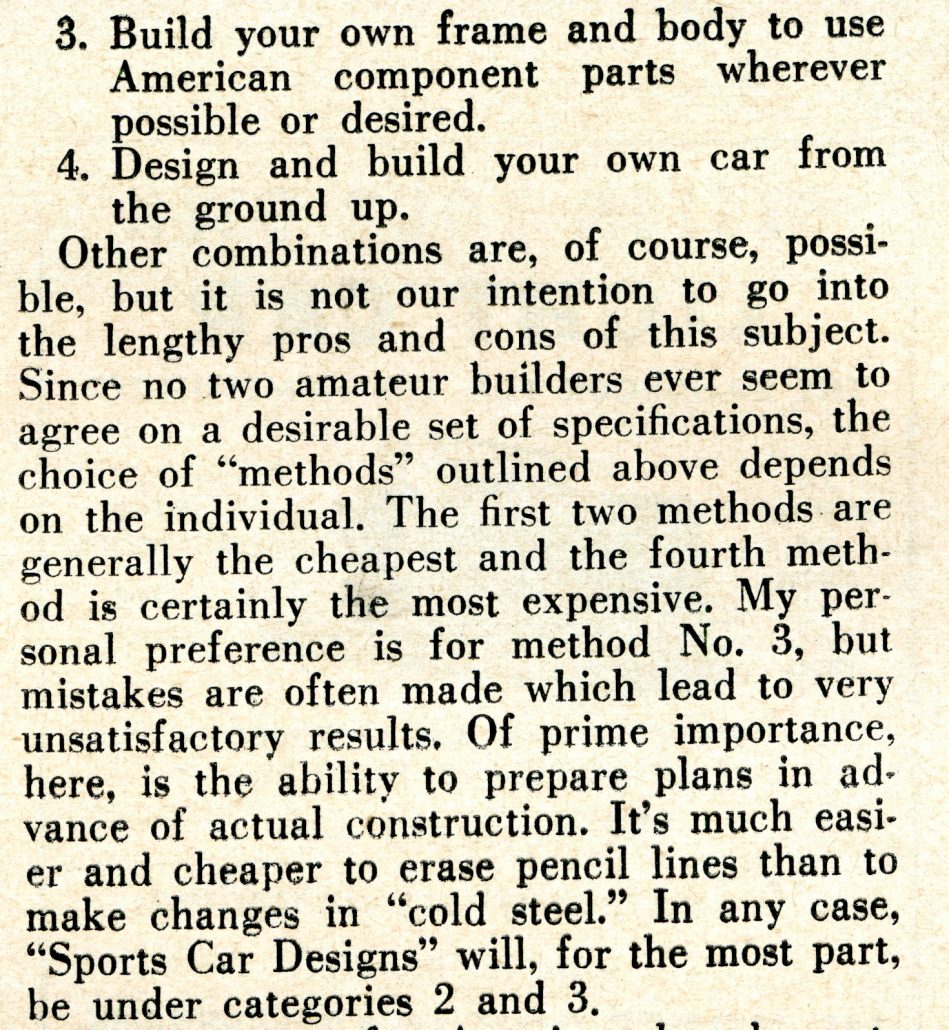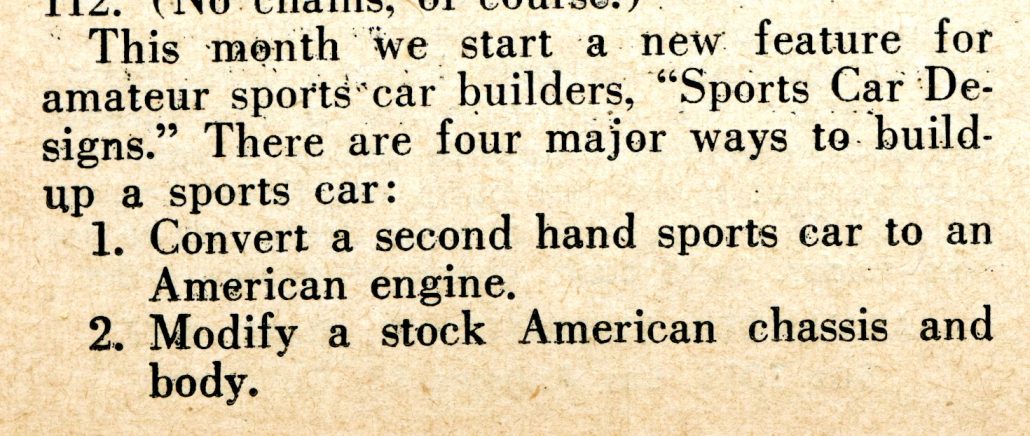 “This month we start a new feature for amateur sports car builders, “Sports Car Designs.” There are four major ways to build-up a sports car: 1: Convert a second hand sports car to an American engine. 2: Modify a stock American chassis and body. 3: Build your own frame and body to use American component parts wherever possible or desired. 4: Design and build your own car from the ground up…….”Sports Car Designs” will, for the most part, be under categories 2 and 3.